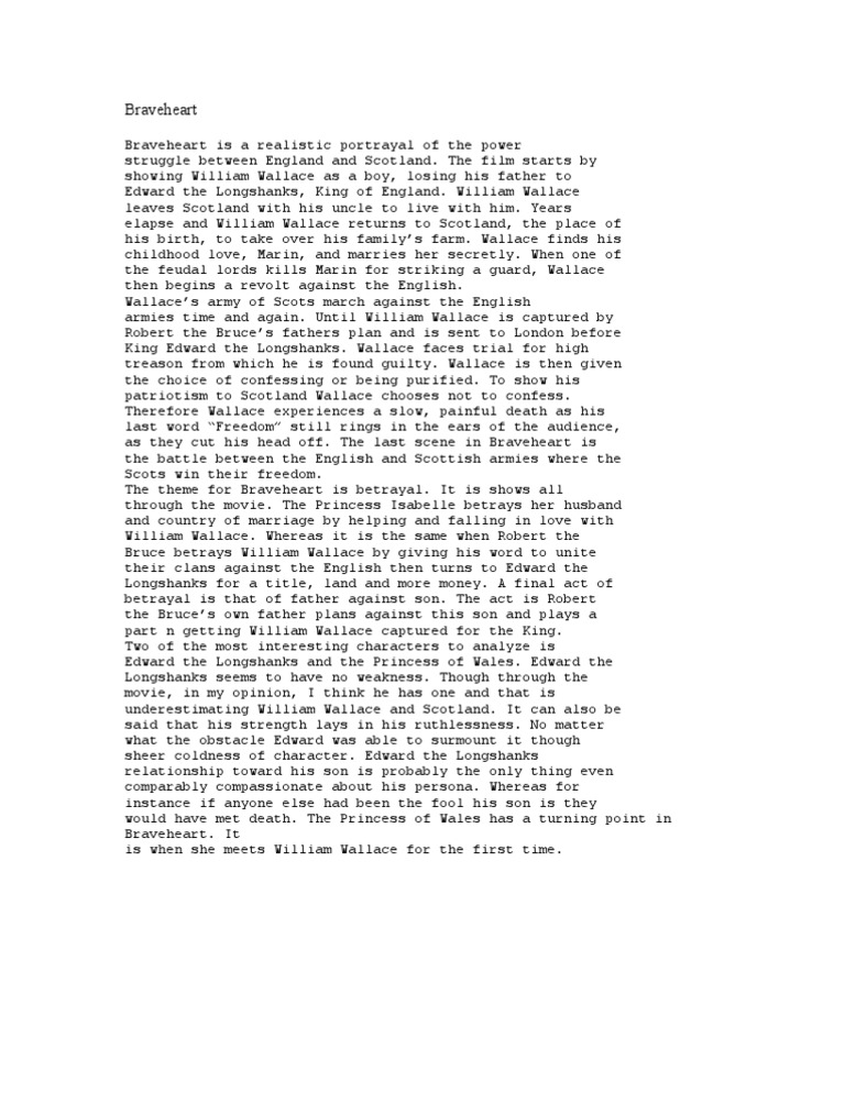 He needs to convince his supporters to risk their lives and take up arms and fight for their homeland. The current situation is that the people of Scotland have to pay rent to braveheart essay King to live on their own land. The King proposes to raise the rent and anyone who does not like that or wishes not to pay will be braveheart essay off their land or killed.